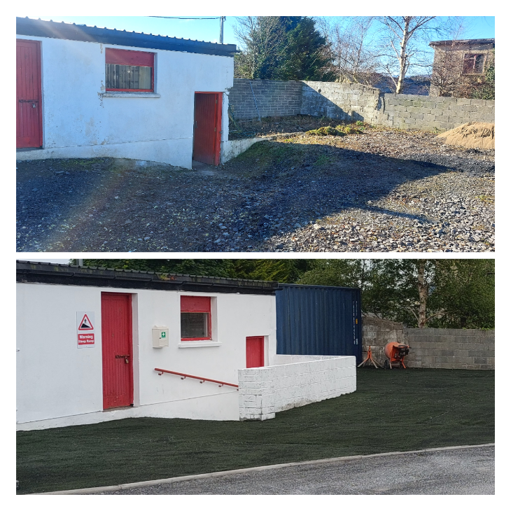 Next up, we renovated the toilet, ramp and recreational area. A timber shed was transported by Gerard & Padraic Corcoran of PPG Construction from the rec area to the club house, no easy task. The second-hand astro grass was transported foc from county Limerick by Cunningham Civil and Marine Engineering, this was laid at a loss by Eoghan and his team. The construction work was undertaken by Kieran Caine and Caine Construction.