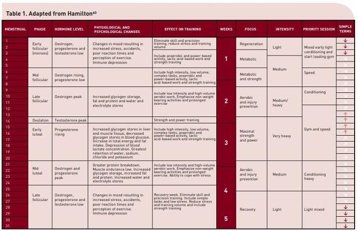 There are some helpful and clear guidelines on the adaptation of training sessions for coaches on individual athlete bases. Implementing these changes in a team setting can be difficult, but this is the reason why we advise coaches to know and understand each individual players’ MC, so that we can plan in advance. For example, if you knew (based on your chats with the players) that in 4 weeks’ time, 6 of your squad should be in the menstrual phase, 4 in the follicular and 5 in the luteal, you can plan and adapt training to meet their needs. Here is a very useful table that outlines exactly how to adapt your training based on what phase the athletes are in
